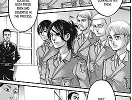 그러나 지크의 능력으로 일반 거인보다 훨씬 빨라진 30체 거인들의 공격 속에서 몇 번의 위기를 넘기며 리바이는 각오를 굳히고 다시 한 번 자신만의 능력으로 위기를 돌파해 나간다. 숱한 동료들의 죽음을 보며 적 구축을 위해 동료의 목숨도 버리라고 제안해온 리바이도 자기 손으로 자기 부하들을 베는 결단은 어려웠을 것이다.