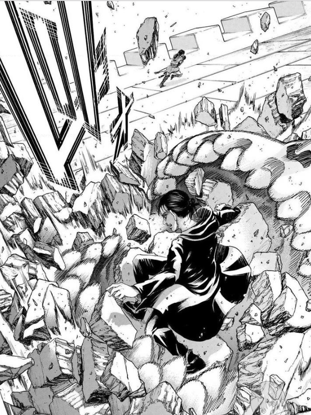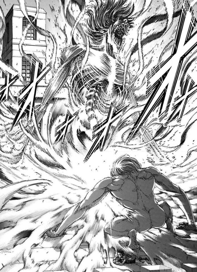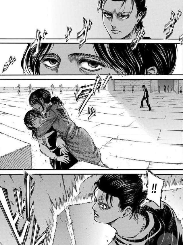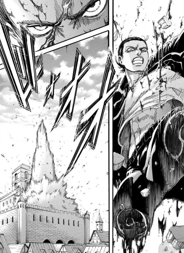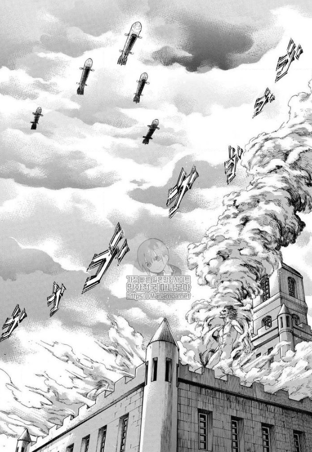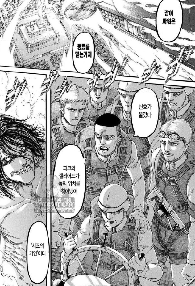 피크는 역시 한번에는 안된다며 상황을 관찰하고, 가비에게 자신은 동료를 믿는다며 하늘을 보라고 말한다. 엘디아 제국 한복판에서 거인화한 엘런의 머리 위로 마레 제국의 특수부대를 태운 비공정들이 나타난다.