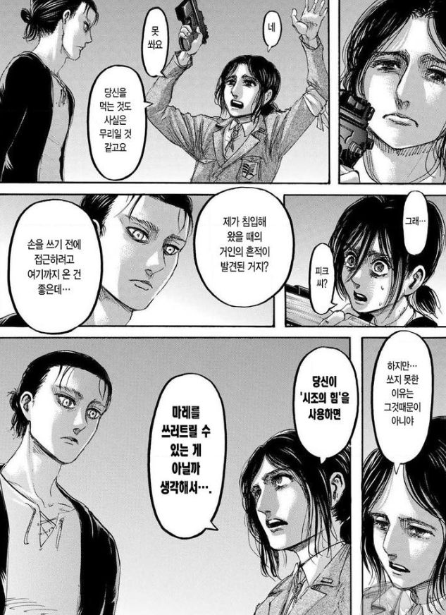 가비는 피크의 말을 듣고 우리를 배신하는거냐며 총을 겨누지만, 피크는 인류의 문명이 발달해서 더이상 거인의 힘이 통하지 않을 날이 멀지 않았고, 그래서 이용가치가 없어진 엘디아인은 마레에게 결국 몰살당할 것이라며 우리의 희망은 마레를 먼저 치는 것밖에 없다고 가비를 설득한다.