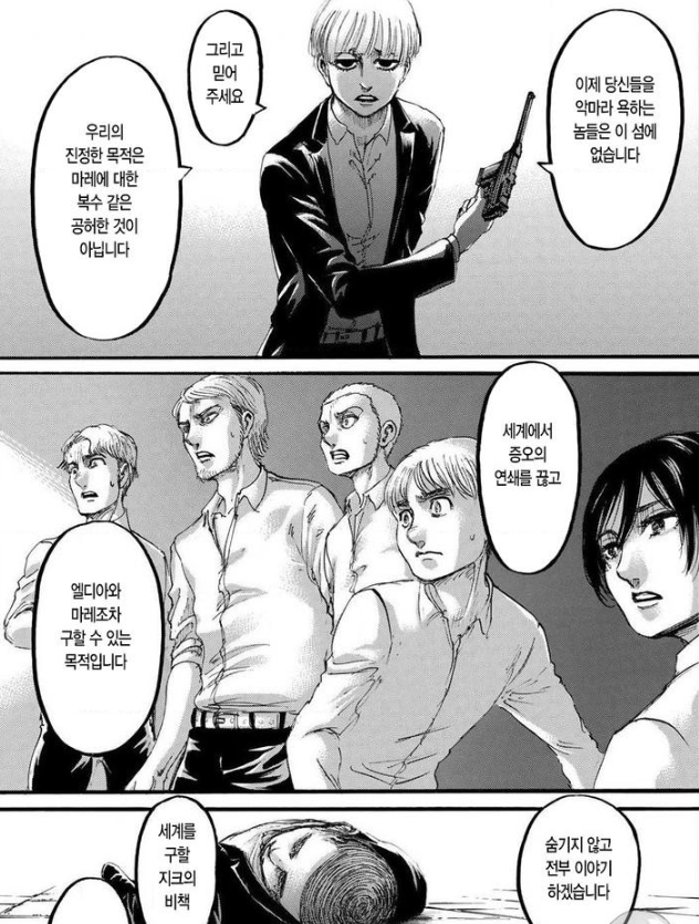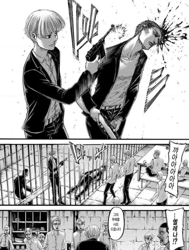 자신의 동료를 아무런 거리낌 없이 죽인 엘레나는 자신들의 진정한 목적은 마레에 대한 복수나 엘디아 제국을 지배하는 것이 아니라 모든 인류를 거인의 공포에서 구한다는 지크의 신념이라며, 지크가 꿈꿔온 안락사계획을 알려준다.