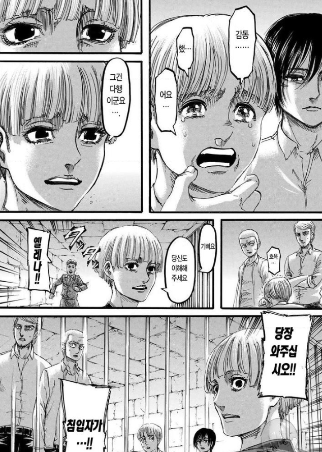 아르민은 그 틈을 파고들기 위함인지 옐레나가에 자신이 매우 감동받은척 한다. 장과 코니, 미카사 등은 그 발연기에 아연실색하지만 옐레나는 웬지 그 연기에 동화된 것 같다. 그때 병사가 달려와 옐레나에게 침입자가 나타났음을 알린다.
