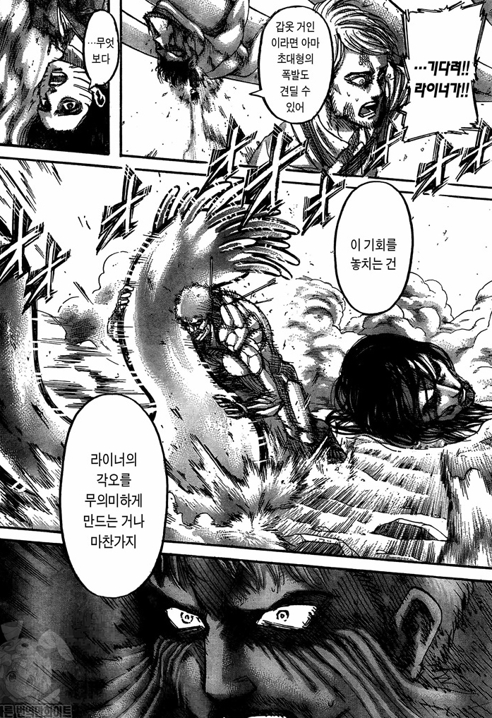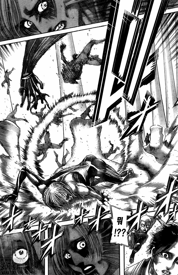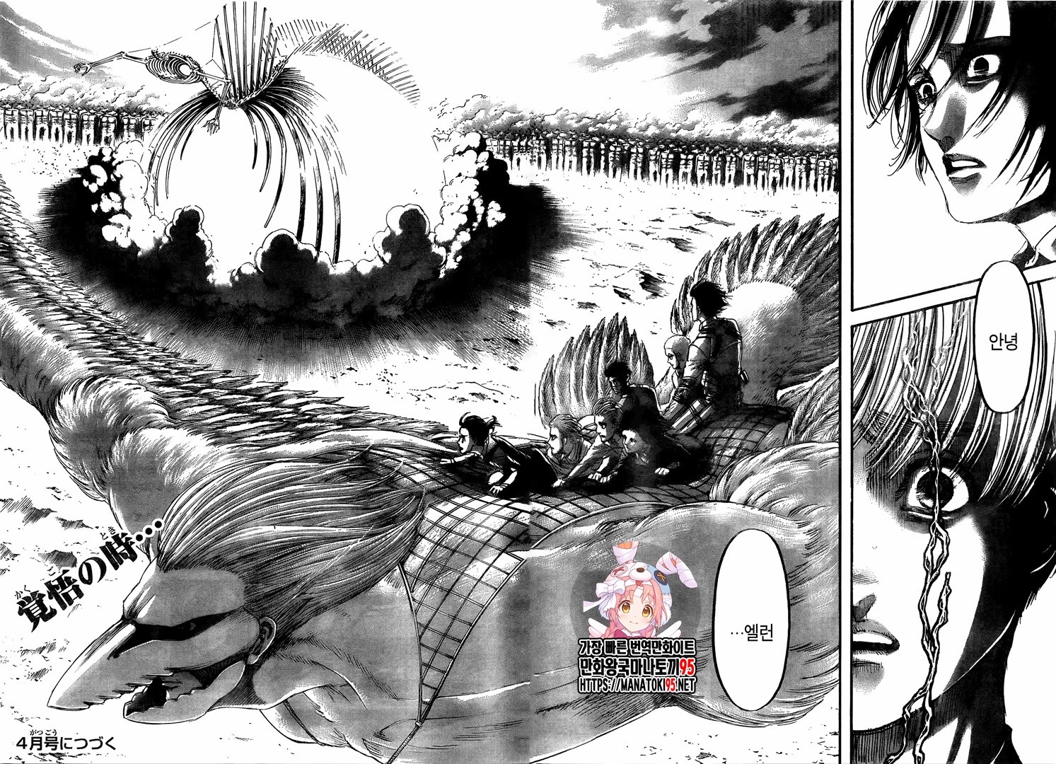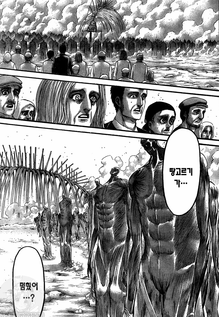 이렇게 사투 끝에 불가능할 것 같았던 시조 거인 공략은 성공한 것처럼 보인다. 그러나 불사의 공간을 만들고 3천년 동안 이 때를 기다려온 최강의 거인 시조 유미르가 이걸로 모든 것을 포기하지는 않을 것 같다. 애초에 이 폭발로 에렌의 시조거인이 끝장날거란 보장도 없다. 한편으로는 앞으로 2화만이 남아 있으므로 어쩌면 이걸로 땅고르기가 멈추고 인류가 구원받으며 에렌과 아르민의 대화가 이어질지도 모른다. 2화만에 끝내는게 무리인 것처럼 느껴지지만, 아쉽지 않은 결말이 되었으면 한다.