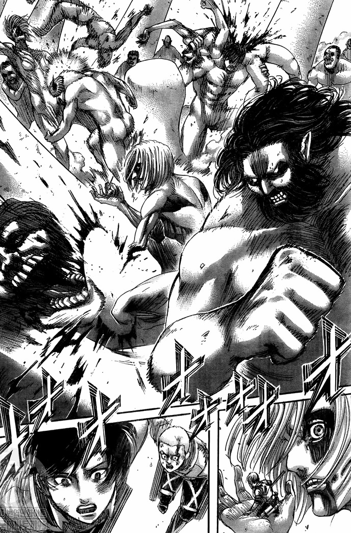 갑작스러운 습격에 전세가 역전되자 리바이와 가비가 아르민을 삼킨 오카피 거인을 저격하고 미카사가 일격을 날려 아르민을 구해내는데 성공한다. 수많은 거인들이 아르민을 향해 달려들지만 '길'에서 각성한 역대 거인들이 나타나 상대를 요격하며 아르민과 조사병단을 지켜낸다.