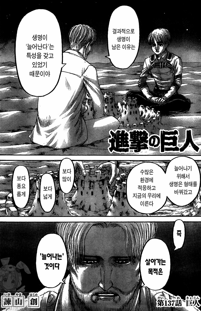 진격의 거인 137화의 제목은 거인. 지난화에서 길에 들어선 아르민은 지크를 만나고, 지크는 아르민에게 생명의 탄생과 시조 유미르에 관한 이야기를 들려준다.