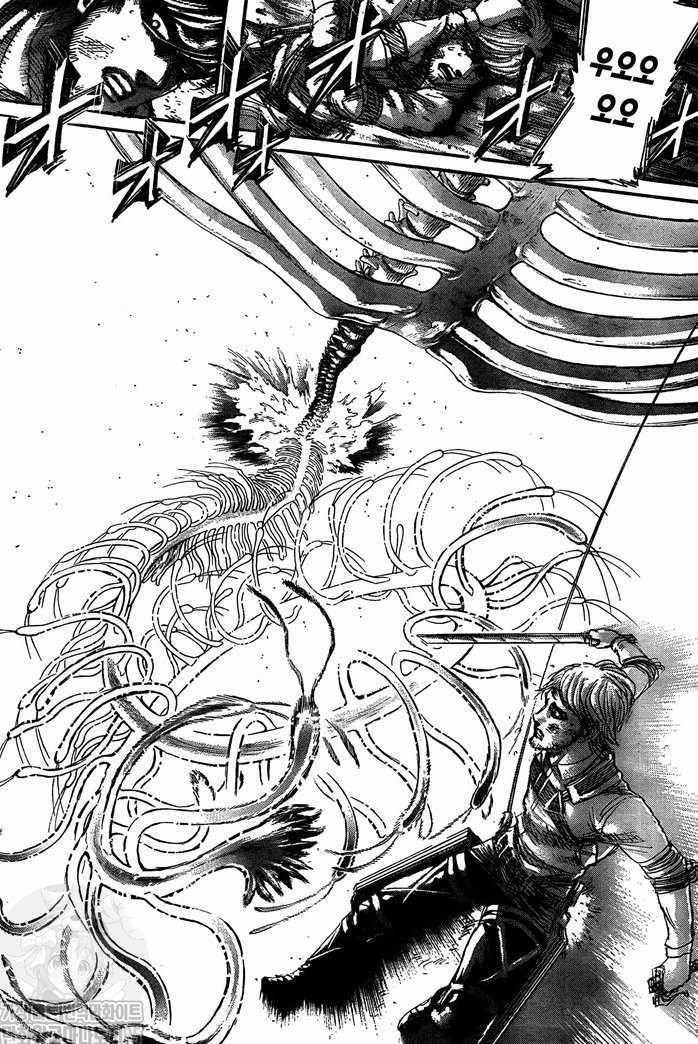 역전의 용사들로 구성된 최후의 조사병단이 이 기회를 놓칠리 없다. 그들은 장에게 길을 열어주기 위해 전력을 집중하고 장은 기폭장치를 가동시키는데 성공한다. 거대한 폭발이 일어나고 시조의 몸과 머리가 분리된 순간, 에렌이 가비에게 저격당했을 때처럼 시조의 척추에서 생명의 근원처럼 생긴 유기체가 나타나 시조의 머리와 몸을 연결하려 한다.