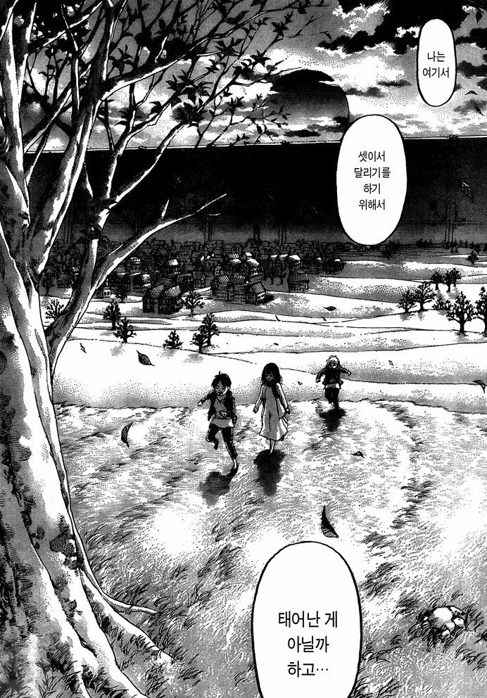 지크는 영겁의 세월동안 길에서 머무른 것처럼 느끼며 삶을 포기하는게 행복할지도 모른다고 말한다. 그러나 아르민은 자신은 삶을 포기하지 않았다며, 어린 시절 에렌, 미카사와 함께 나무를 향해 뛰어가던 기억을 떠올린다. 그 순간은 너무나 행복해 마치 자신이 그 시간 그 장소에 있기 위해서 태어난게 아닐까 할 정도였다고, 그리고 그런 추억이 너무나 많았기에 아직 자신도 인류의 삶도 포기할 수 없다고 말한다.