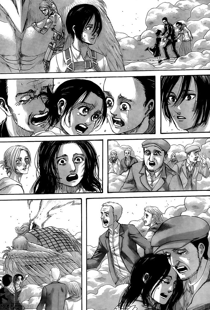 이 장면은 에렌의 의식이 미카사와 이어져 그의 마음을 전달한 것처럼 보인다. 그러나 미카사는 이 꿈에서 깨어나 두통도 떨쳐내고 에렌을 죽이기로 결심한다. 설령 에렌이 인류 말살계획을 실행하지 않고 미카사와 둘이 여생을 보내고 싶은 욕망이 있었다 하더라도 지금의 현실은 살아남은 장, 코니를 포함한 애니와 피크의 부모들마저 거인화된 절체절명의 상황. 아르민의 초대형거인의 폭발력에도 끄떡없이 살아남은 빛나는 생명체를 죽일 방법이 없으므로 단 하나의 선택지는 에렌을 죽이는 것 뿐이다.