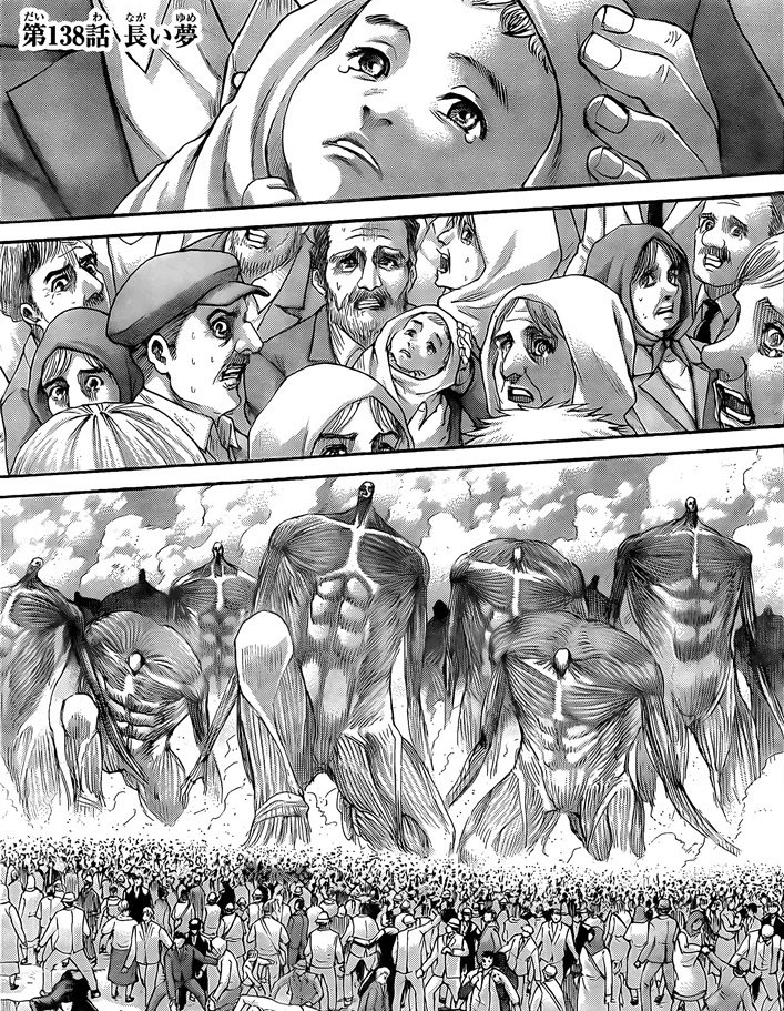 진격의 거인 결말까진 이번화를 포함해 앞으로 2회. 139화로 마무리될 진격의 거인은 이제 마지막 스토리를 그려 낸다. 138화 기나긴 꿈은 특공으로 시조거인과 땅고르기를 멈추는데 성공한 조사병단과 그들에 의해 구원받은 인류 생존자들을 보여주며 시작한다.