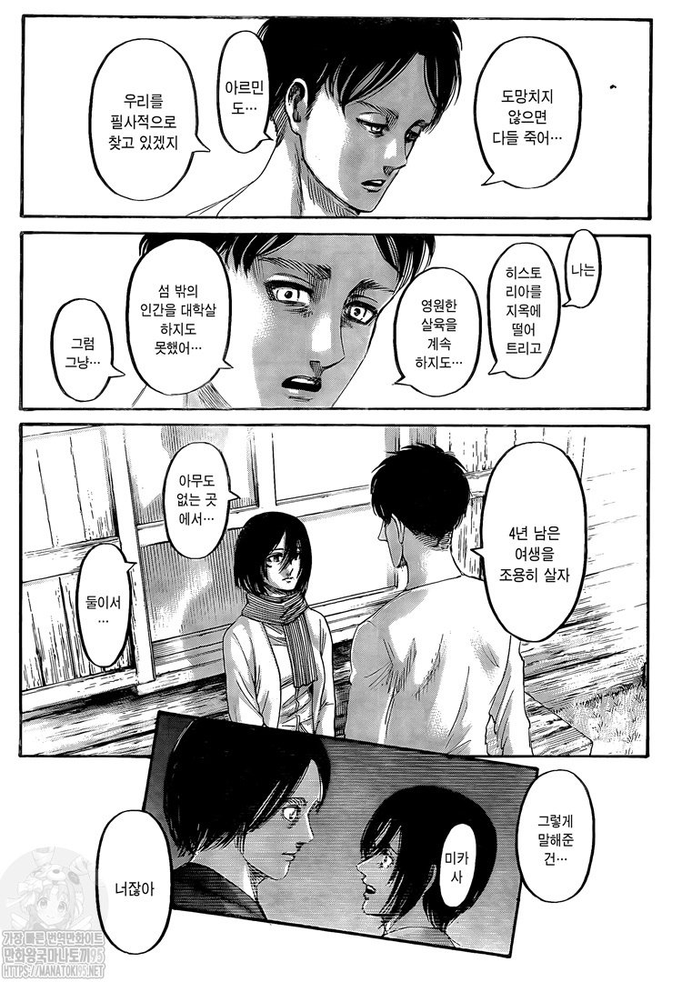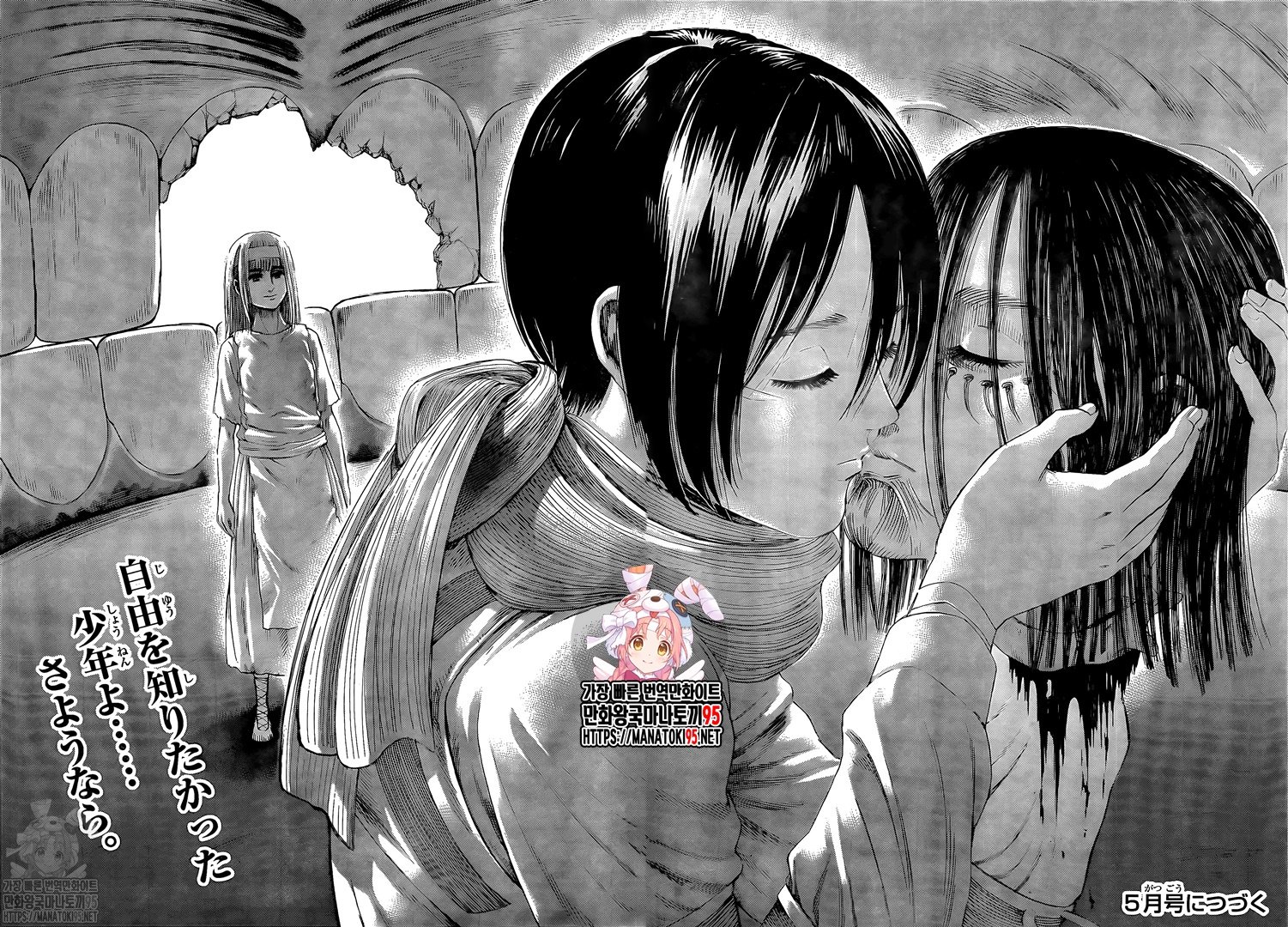 이번 화의 마지막은 미카사가 에렌의 입에 키스를 하는 장면이다. 이루지 못한 사랑과 그 사랑을 죽여야만 했던 미카사가 에렌의 처절한 선택을 이해한다며 이제 모든 것을 놓고 좋은 곳으로 떠나라는 작별의 키스인 것 같다. 그 뒤에는 웃고 있는 유미르가 보인다. 아마 유미르가 맞을 것이다. 그 옆에는 '자유를 알고(찾고라고 의역하는게 자연스러울 듯) 싶어했던 소년이여 안녕'이라는 문구가 보인다. 이렇게 마지막-1화는 마무리된다.