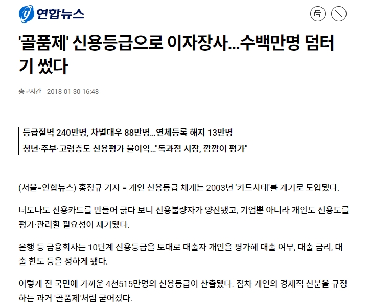 대형은행과 카드사가 주로 사용하는 신용등급은 민주주의 사회의 적이다. 국가가 취약계층을 보호하고 지원하기 위해 비공식적으로 사용해야할 소득등급이 대형 금융권력의 신분기준으로 사용되며 취약계층을 더욱 약화시키고 있기 때문이다. 한국이 실질적인 신분제 사회라고 여겨지는 이유 중 하나다.