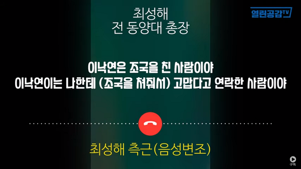 최근 열린공감TV에서 최성해 동양대총장의 녹취가 공개되며 파장이 일었다.이 녹취의 내용은 최 총장이 측근에게 이낙연은 조국을 친 사람이야. 이낙연이 나에게 조국을 쳐줘서 고맙다고 연락했다 라는 것이다. 그런데 이낙연은 곧바로 이상한 대응을 한다.
