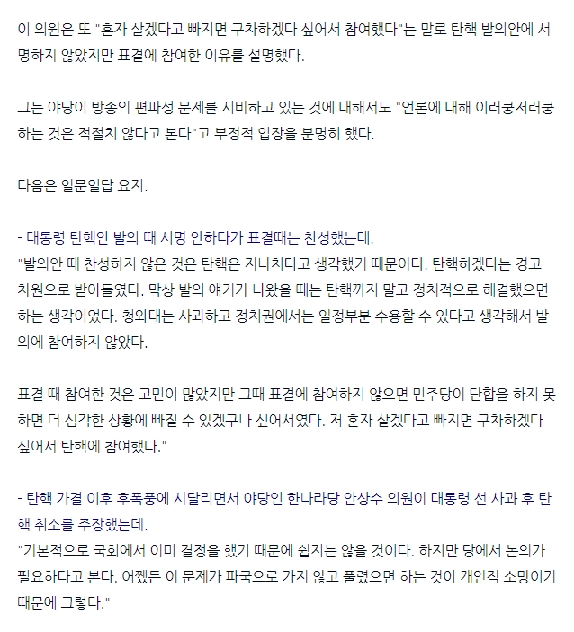 표결 때 참여한 것은 고민이 많았지만 그때 표결에 참여하지 않으면 민주당이 단합을 하지 못하면 더 심각한 상황에 빠질 수 있겠구나 싶어서였다. 저 혼자 살겠다고 빠지면 구차하겠다 싶어서 탄핵에 참여했다."