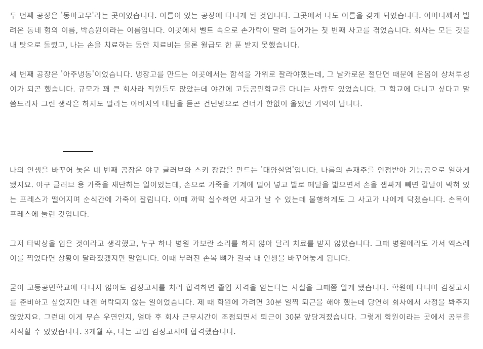 이재명은 무수저 출신이라 성남으로 이사온 후 공장을 다녀야 했다. 이름 없는 공장의 이름 없는 공돌이였다고 과거를 회상하는 그는 몇 번이나 산재를 당하면서도 일을 해야 했고 학교도 제대로 다니지 못했다. 그는 공돌이로 주경야독한 검정고시 출신이다.