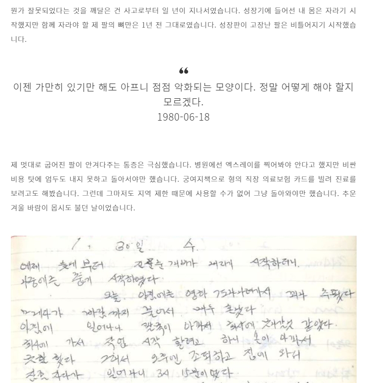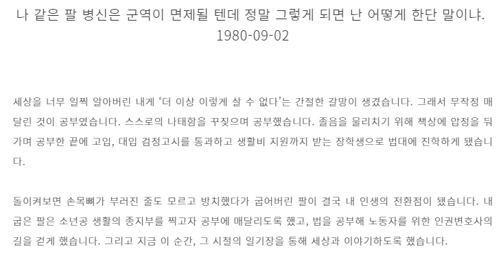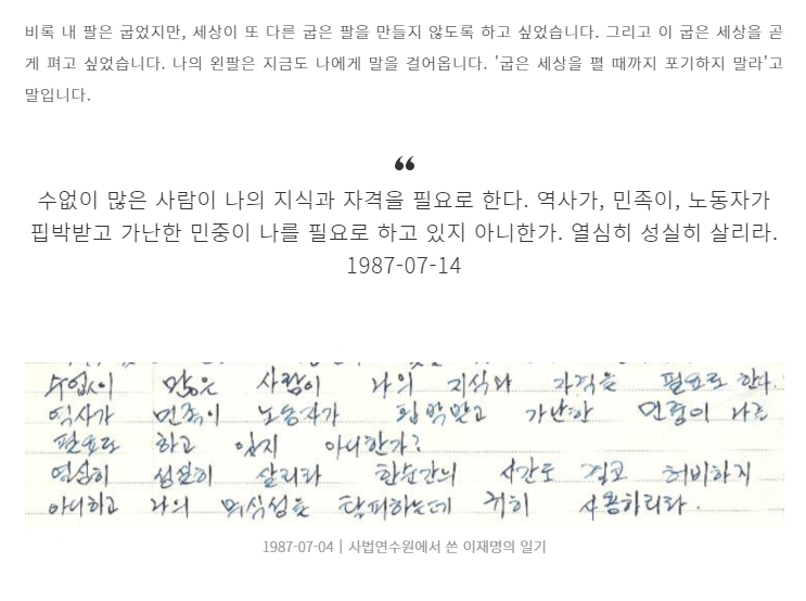 이재명의 팔은 지금도 휘어 있다. 그는 누구보다 밑바닥 삶을 잘 아는 사람이다. 그의 다이어리를 보면 당시의 억울함과 고통을 알 수 있다. 팔이 휘어 군대도 못가게 된 청소년 시절의 이재명은 좌절했지만, 그로 인해 공부에 올인해야만 하는 입장이 되었고, 그 어려운 환경에서 졸리면 압정으로 자신을 찔러가며 검정고시를 거쳐 장학금을 받고 대학에 진학하게 된다. 그리고 사시에 재수도 하지 않고 곧바로 합격하여 사회의 부조리와 싸우는 인권 변호사의 길을 걷게 된다.