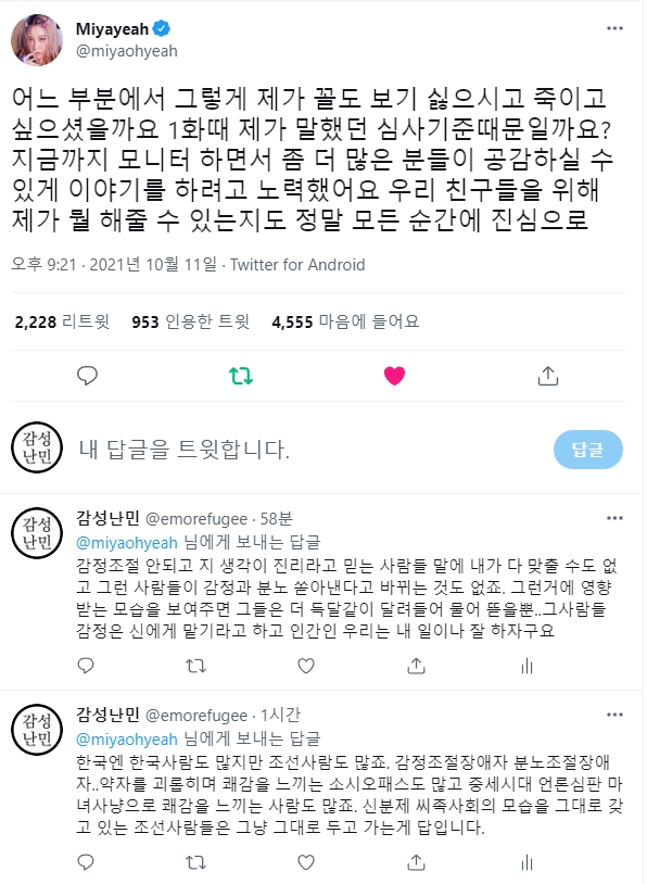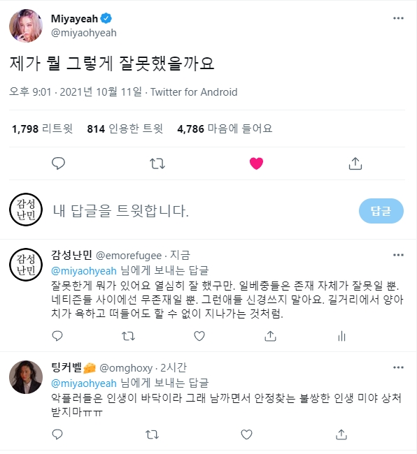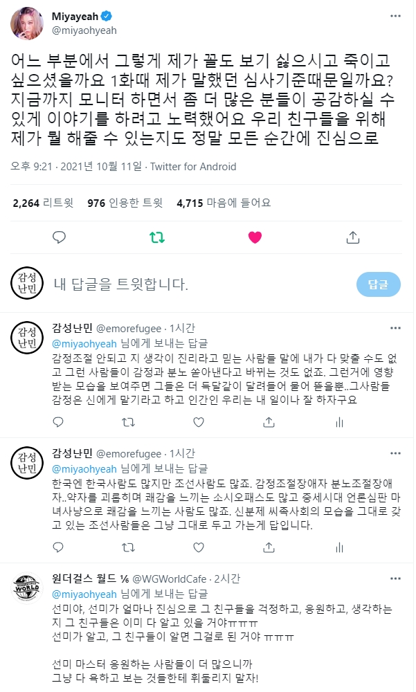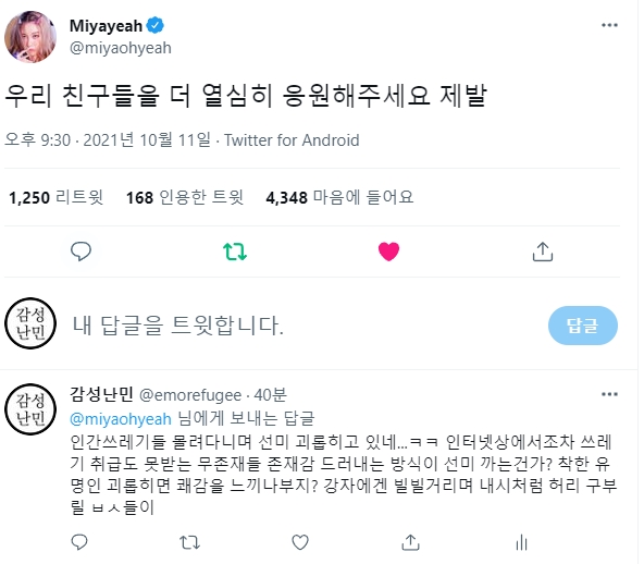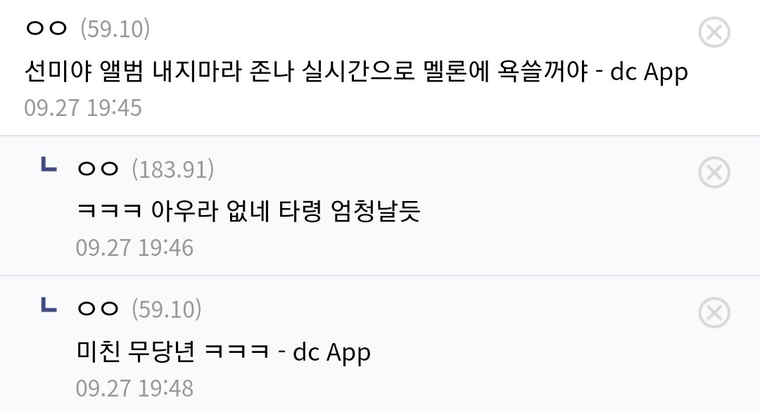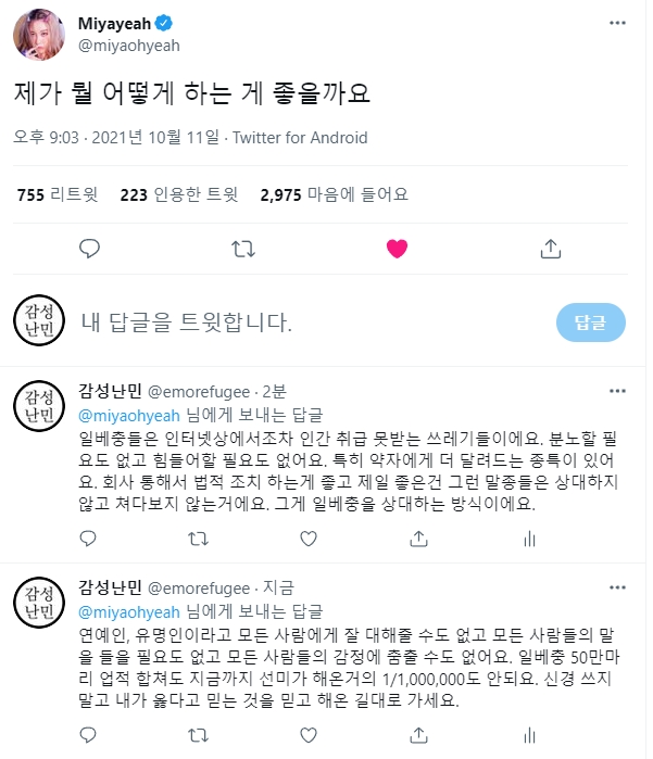 자기 분야에서 최선을 다해 살아온 선미를 이런식으로 괴롭히면 안되지. 선미 뿐 아니라 그 누구라도. 급한 김에 댓글들 남기고 왔는데 조금이라도 도움이 될지...확실한건 일베충은 사회의 좀벌레, 악의 축이라는 거다. 찌질한 놈들 같으니라고. 소속사에서 나서서 확실히 대응해 줘야 한다. 여자 연예인 혼자 앓게 하지 말고. 선미가 잘 이겨낼 수 있기를 응원한다.