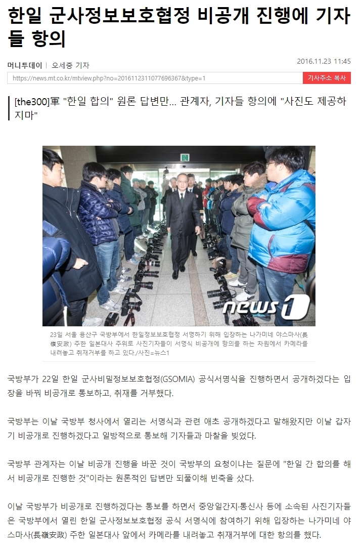 같은해 11월 미국의 주도 하에 일본의 일개 대사가 한국의 국방부를 찾아와 한국의 군사기밀을 일본과 공유하는 한일 군사정보보호협정에 서명했다. 이런 중요한 협정을 대사가 와서 서명하는 것은 초유의 사태였고, 그 내용도 제대로 공개되지 않았으며 서명식마저 비공개로 진행했다. 이에 기자들이 일본 대사 앞에서 카메라를 내려놓고 항의하는 사태까지 벌어졌다. 나는 이것을 한국의 친중 행보에 위안화 국제화 뿐만 아니라 군사기밀 누출에 준하는 내용이 포함되어 있었고 이를 미국이 견제하기 위해 일본을 끌어들인 것이라고 해석한다. 한국의 군사기밀을 중국이 아닌 일본이 관리해 달라는 것으로, 사실상 60~70년대 미국이 취했던 일본을 통한 동북아 전략에 준하는 것이다. 그렇지 않다면 이렇게 급하게 일본 대사가 나타나 사인을 하며 한국에 굴욕을 줄 리는 없었을 것이다.