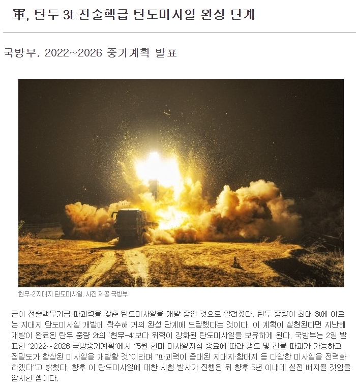 박근혜 정부 당시 15위 수준이었던 한국의 군사력은 단숨에 6위에 올라와 있다. 한국은 문재인 정부 들어 2차례에 걸쳐 미사일 사거리 지침을 완전히 폐기시켰고, 이미 그 사거리 지침 시기를 알고 있었다는듯 전술핵급 미사일을 보유해 버렸다. 영국, 이탈리아, 프랑스보다도 한국의 군사력이 위인 상황이다. 여기엔 KF-21과 현무가 큰 역할을 했을 것이다.