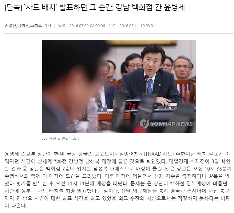 미국은 결국 한국 정부의 극렬한 반대에도 2016년 7월 사드를 전격적으로 배치했고, 당시 박근혜의 외교부 장관은 쇼핑 중이었다. 열병식 이후 박근혜 정부를 안하무인 취급하던 중국은 곧바로 사드 보복을 감행했고 한국 기업과 국민들은 엄청난 피해를 입었다. 한국 정부는 갑자기 사드가 북한 핵미사일을 방어할 수 있다며 개돼지들을 선동하기 시작했다.