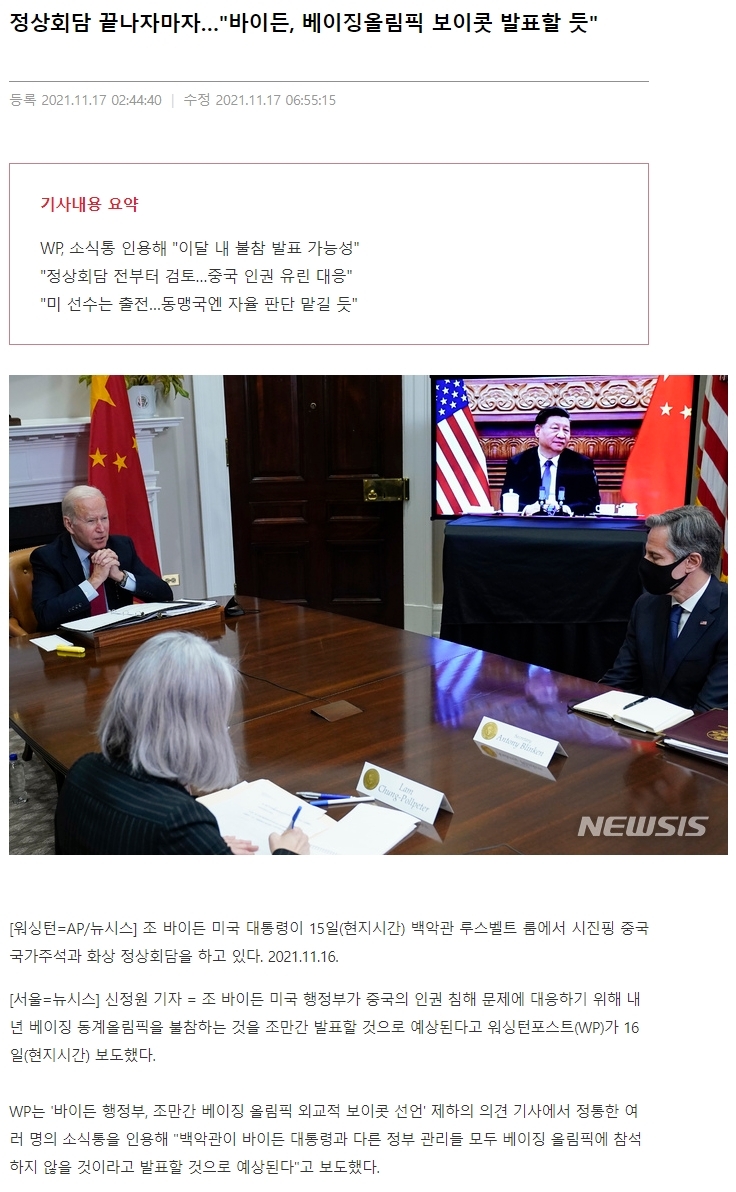 미국은 어제 중국과의 화상 정상회담에서 점잖은 어조로 중국의 입장을 이해한다고 말했다. 심지어 대만 독립을 지지하지 않는다고도 말했다. 그걸로 또 언론은 시끄럽다. 그러나 미국은 협상의 달인들이 득시글거리는 곳이고 국익을 가장 적극적으로 실현시켜온 나라이다. 정상회담에서 말싸움하고 언론 기사 하나하나에 일희일비할 바이든이 아니다. 바이든은 트럼프처럼 아마츄어 선동가가 아니라, 미국 내에서도 가장 오랜 외교 경험을 갖고 있는 사람이다. 그래서인지 이렇게 정상회담 직후 베이징 올림픽 보이콧 선언할 분위기를 띄우고 있다. 바이든은 자신의 집권기간 내에 중국에 큰 타격을 입히려고 하는 것 같다. 나는 그렇게 생각한다.