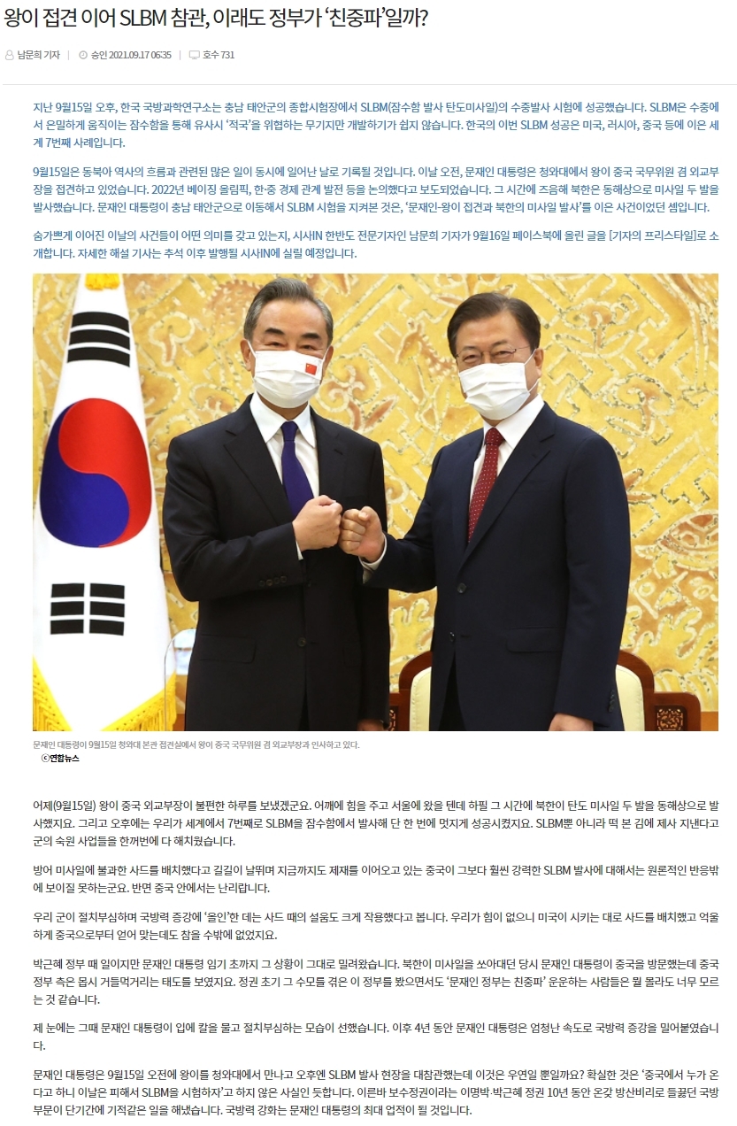 얼마 전 한국은 왕이 외교부장 방한일에 맞춰 세계에서 7번째로 SLBM 시험발사에 성공했고 현무 등 화력쇼를 펼치며 역사상 최대치로 중국을 몰아붙였다. 중국에서는 굴욕외교라며 난리가 났지만 한국 언론은 당연히 침묵했다. G2 외교부장 방한일에 미사일 발사실험을 할 정도로 한국은 국방력에 자신감이 생겼고, 중국에 이런 굴욕을 준 것은 자주국방, 자주외교라고 설명할 수도 있겠지만 미국과의 공조가 없이는 불가능한 일일 것이다.