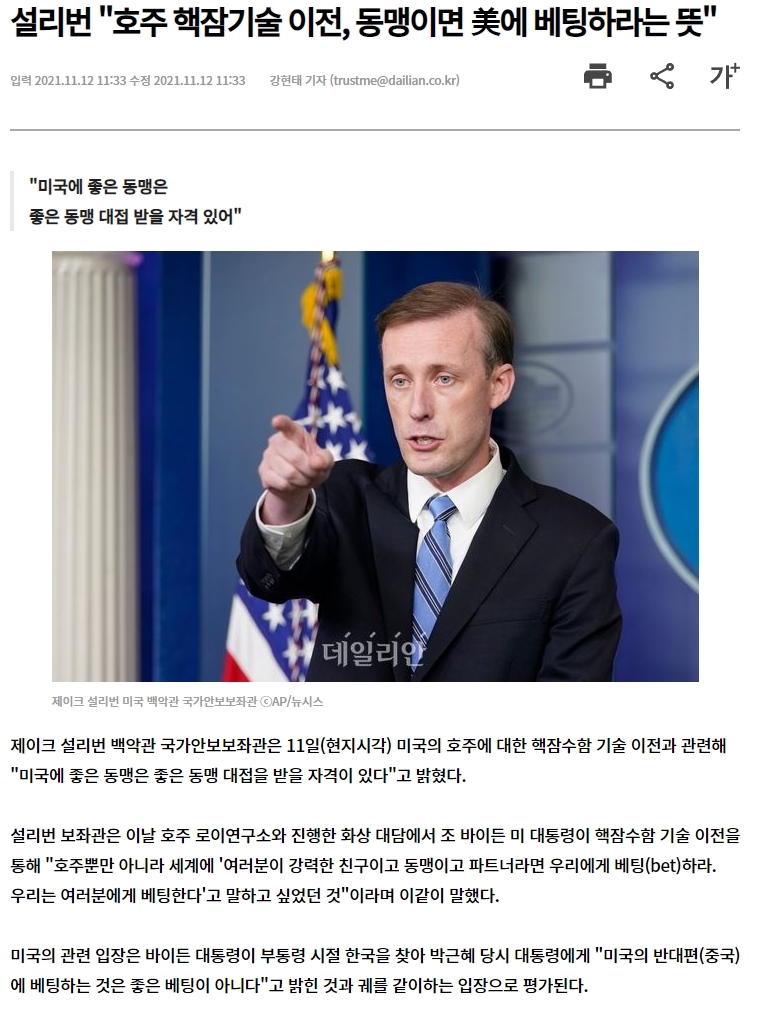 미국에서 100년에 한 번 나올 천재라 불리는 설리번 국가안보보좌관은 최근 의미심장한 발언을 했다. 호주에 핵잠기술을 이전한 것과 관련해 "호주뿐만 아니라 세계에 '여러분이 강력한 친구이고 동맹이고 파트너라면 우리에게 베팅(bet)하라. 우리는 여러분에게 베팅한다'고 말하고 싶었던 것"이라고 아예 대놓고 선언했다. 이 발언은 사실 바이든이 부통령 시절 초 멍청한 짓을 하고 있던 박근혜 정부에게 직접 대놓고 한 말이다. 당시 친중으로 급격히 기울던 한국의 박근혜 대통령에게 바이든은 "미국의 반대편(중국)에 베팅하는 것은 좋은 베팅이 아니다"라고 언급했었다. 물론 그 말을 못 알아들은게 지금의 국민의힘과 박근혜지만.