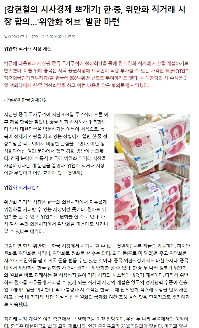 거기까지는 귀엽다고 봐줄 수도 있는 미국이었지만, 한국은 건드리지 말아야할 역린까지 건드렸다. 바로 대놓고 미국의 달러패권에 도전하겠다고 외치는 중국의 손을 들어준 것이다. 박근혜 정부는 야심차게 위완화 직거래 시장을 대한민국 한복판에 설립했고, 모든 언론은 빨아대기 바빴다. 경제가 좋아질 것 같았다. 그러나 이것은 미국의 핵심이익인 달러패권에 한국이 앞장서서 도전한 것으로, 미국은 이때부터 한국을 전략적으로 배제하기 시작한다.