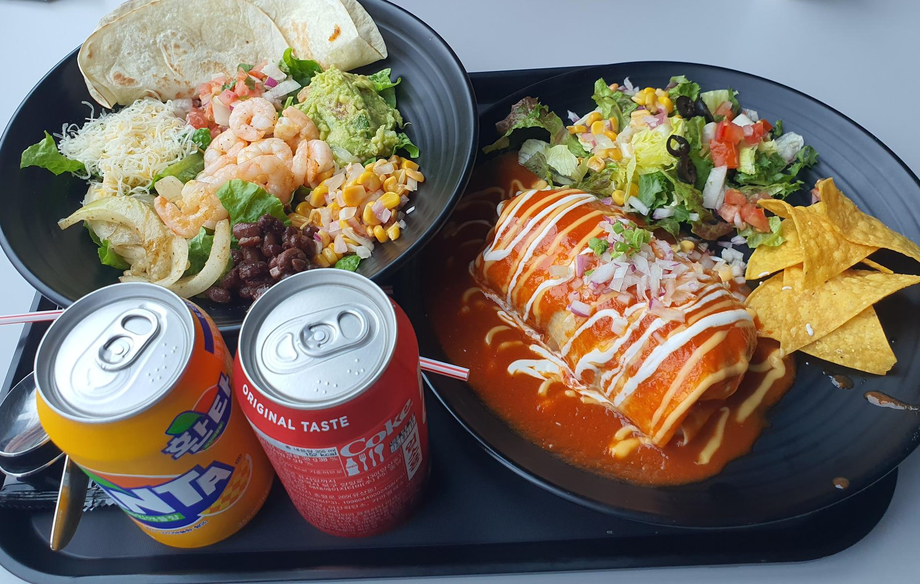 쉬림프 브리또볼과 치킨 엔칠라다의 모습.