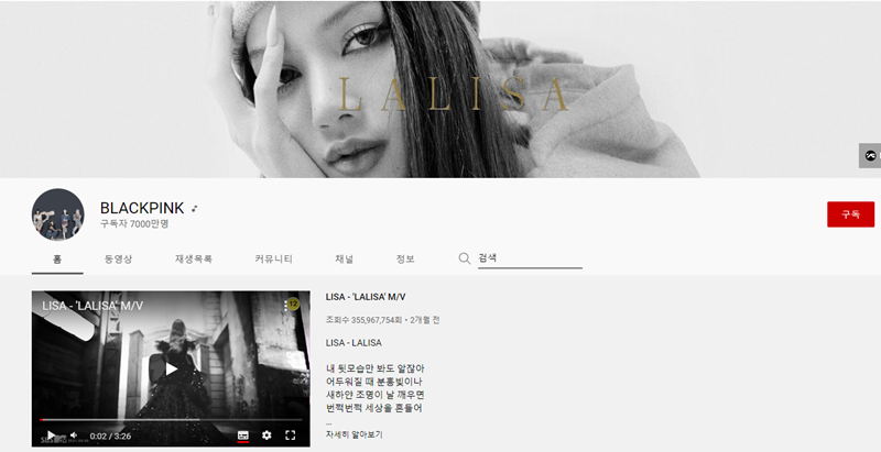 최근 리사의 첫 솔로 앨범 ‘LALISA’가 발표되면서 500만 명 이상의 신규 구독자가 유입된게 컸다. 태국을 비롯한 동남아쪽 팬들에게 많은 사랑을 받으며 시장을 넓힌 것이 주효한 것. 블랙핑크는 유튜브 누적 조회수 213억 회를 기록 중인데, '뚜두뚜두(DDU-DU DDU-DU)'는 17억뷰를 돌파하며 K팝 그룹 최초∙최고·최다 조회수 신기록을 자체 경신 중이다. 이외에도 ‘Kill This Love(14억뷰), '붐바야(13억뷰)', '마지막처럼(11억뷰)', ‘How You Like That(10억뷰)’ 등 10억뷰 영상을 5개나 보유하고 있다.