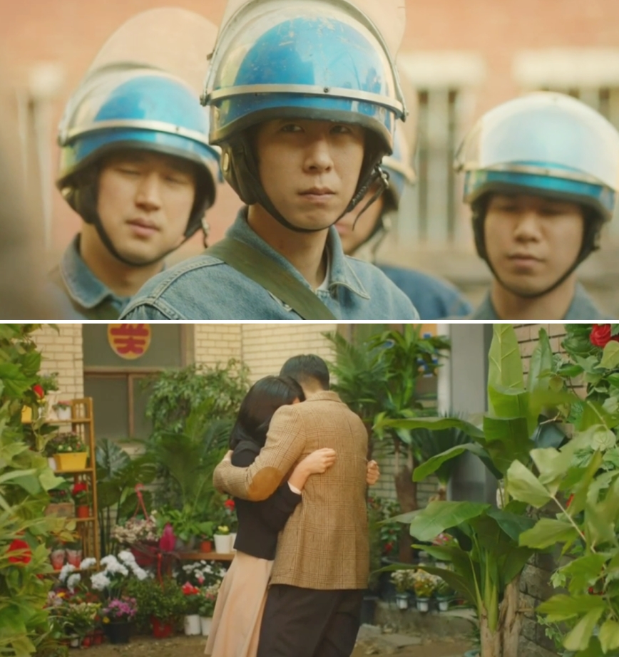 여주인 지수는 남주인 정해인을 쫓아오는 백골단으로부터 연인인 척 연기하며 구해준다.