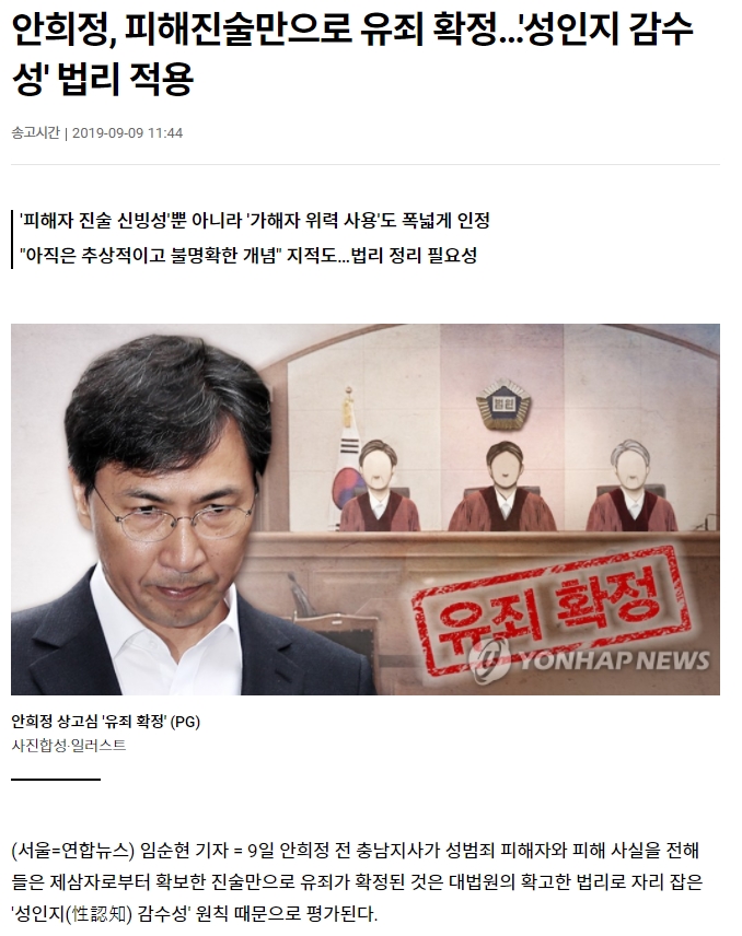 "안 전 지사의 범행을 직접적으로 증명할 물적 증거가 없었기 때문에 이들 진술의 신빙성을 얼마나 인정할 수 있는지가 재판의 쟁점이 됐다. 1·2심에서 진술 신빙성을 판단하는 데 적용된 법리가 바로 '성인지 감수성' 원칙이었다. 1심은 "진술에 다소 모순이나 비합리성이 있더라도 피해자가 처해 있는 특별한 사정을 충분히 고려해야 한다"면서도 범행이 발생한 당일 저녁 김씨가 안 전 지사와 와인바에 동행한 점 등을 들어 김씨의 진술을 믿기 힘들다고 판단했다. 반면 2심은 "김씨가 범행을 폭로하거나 수행비서로서의 업무를 중단하지 않고서 그 업무를 성실히 수행했다고 해서 그러한 행동이 실제 피해자의 모습이라고 보기 어렵다고는 할 수 없다"며 김씨의 진술에 신빙성이 있다고 봤다."