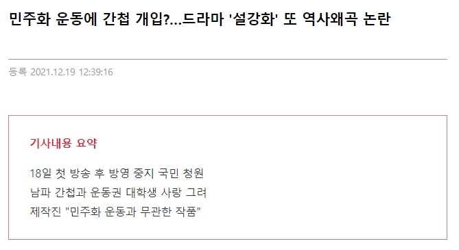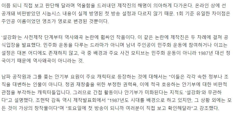 "그러나 민주화운동을 하다 억울하게 간첩 누명을 쓰고, 고강도 고문에 시달리며 죽음까지 이른 희생자들이 실존하는 상황에서 이 같은 설정을 내세운 것 자체가 의문이다. 가상이라는 허울 좋은 명분으로 운동권 학생들 중에는 실제 간첩이 존재했다는 설정을 전면에 내세우는가 하면 운동권 학생을 쫓고 고문한 악랄한 대다수의 안기부가 아닌 간첩을 쫓는, 이른바 '대쪽같은' 안기부 요원을 집중 조명하는 행위 자체가 민주화운동 폄훼 및 안기부 미화와 다름없어 보인다. 창작의 자유는 폭넓게 보장되어야 하지만 '설강화' 제작진과 배우들에게 여전히 뼈아픈 민주화운동 역사를 왜곡하고 훼손할 자유는 없다는 것이 중론....