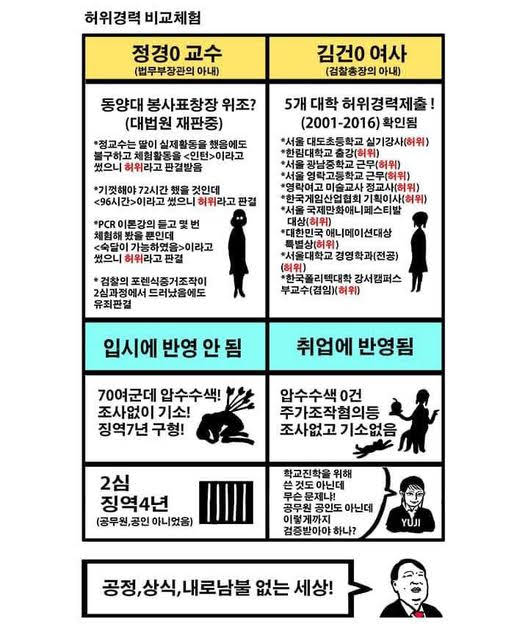조국에 대해서는 최근 김건희를 통해 세간에서 많이 인정하는대로 검찰이 입증하지도 못한 표창장 위조를 법원이 그러한 의도가 있다고 받아 무려 4년형을 때린 사건이다. 법무부 장관 가족의 비리를 캐내려 70여군데 압수수색을 해서 고작 밝혀낸 것이 고등학생에게 준 표창장을 위조했다는 것이었고, 그 위조했다는 것조차 검찰은 입증하지 못했으며, 학교는 그 표창장이 합격에 영향을 주지 않았다고 밝혔다. 내신, 수능점수 등이 있었기 때문이다.