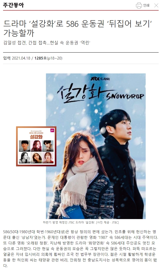 아무튼, 주간동아 기사로 돌아가서 이들이 설강화를 어떤 시각으로 바라보는지 더 살펴보자.