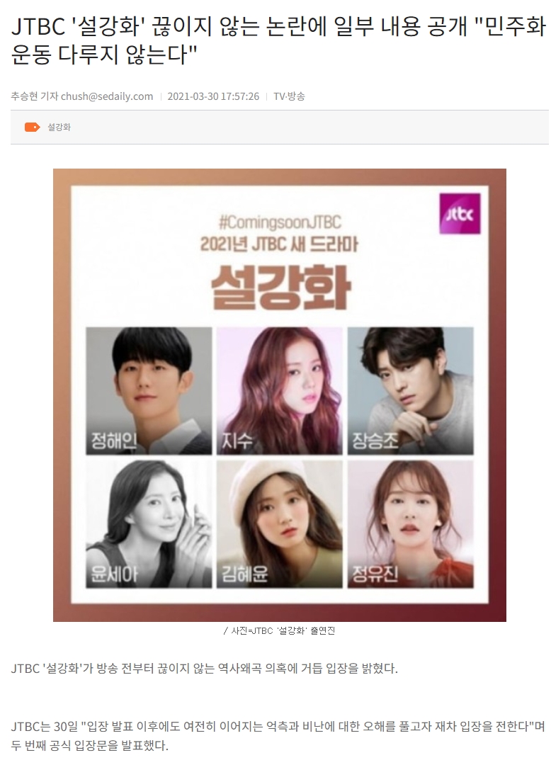 설강화는 제작발표때부터 시끄러웠다. JTBC는 공식 입장까지 발표하며 올해 3월에도 민주화운동을 아예 다루지 않는다고 항변했다.