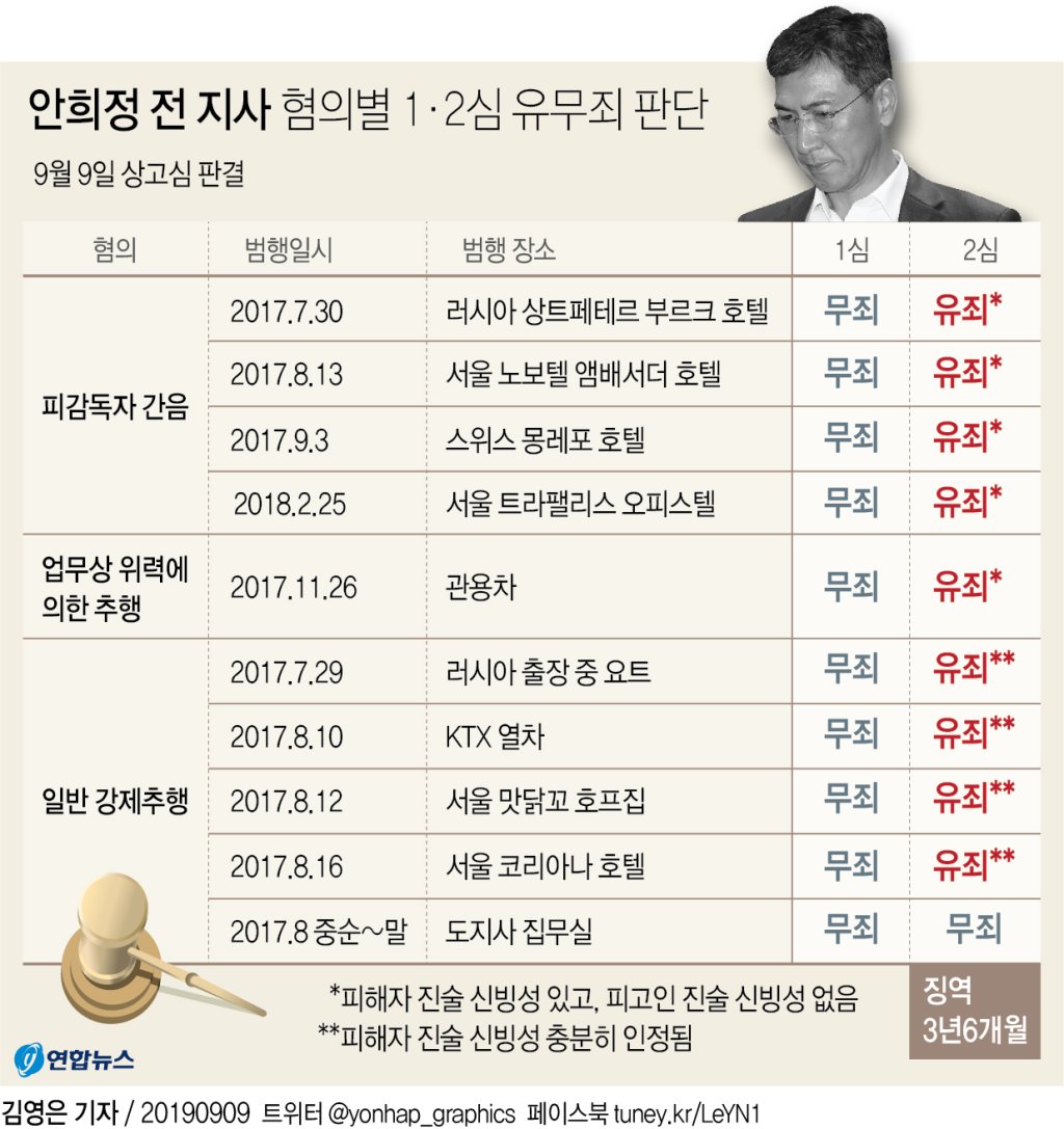 "얼어붙었다는 상황에서 도지사를 껴안는 건 의문", 안 전 지사 아내는 앞서 열린 공판에 피고인 측 증인으로 출석해 '문자메시지와는 무관하게 김씨가 몰래 방에 들어와 잠자는 우리 모습을 수 분간 지켜봤다'는 내용의 증언을 했다., "安 위세에 눌려 씻고 나왔다" 진술 신빙성 낮게 봐, 호텔 만실이 아닌데도 운전비서에게 방 없다고 말해, "상화원 사건 김씨 증언은 모순, 불명확한 점들 다수", "텔레그램 중요 증거인데 모두 삭제, 의심스러운 정황", "사안이 법정에 온 이상 형사법적 원칙 따라 심리해야..합리적 의심의 여지 없을 정도로 공소사실 증명 안돼"