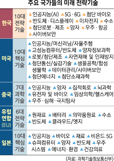 정부는 공급망·통상, 외교·국방, 신산업육성 등 3가지 측면에서 반드시 주도권을 확보해야 할 ‘10대 국가 필수전략기술’을 선정했다. 글로벌 기술패권 확보와 한국의 미래 생존을 위해 집중적으로 육성하고 보호해야 할 기술로 ▲인공지능 ▲5G·6G ▲첨단 바이오 ▲반도체·디스플레이 ▲이차전지 ▲수소 ▲첨단로봇·제조 ▲양자 ▲우주·항공 ▲사이버보안까지 10개를 꼽았다.