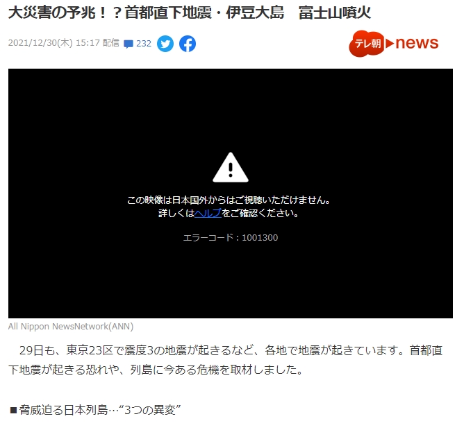 그런 와중에 지난 12월 30일 아사히 TV 계열 ANN에서 일본의 3대 이변에 대한 기사를 게재해 눈에 띄어 소개한다. 올해 오성취루 등 고대 천문학에서 이변을 상징하는 천문현상과 일본 지진 전문학자들의 견해가 묘하게 겹치는 느낌이다. 해당 매체는 지난 12월 29일 도쿄에서 진도 3의 지진이 일어나는 등 각지에서 지진이 일어나고 있고, 수도 직하 지진이 일어날 우려와 함께 일본 열도에서 발생할 수 있는 3가지 이변에 대해 기사화했다.