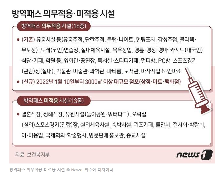 한편 방역패스 적용 시설은 총 17종으로 늘어났다. 유흥시설 등(유흥주점, 단란주점, 클럽·나이트, 헌팅포차, 감성주점, 콜라텍·무도장), 노래(코인)연습장, 실내체육시설, 목욕장업, 경륜·경정·경마·카지노, 식당·카페, 학원, 영화관·공연장, 독서실·스터디카페, 멀티방, PC방, (실내)스포츠경기(관람)장, 박물관·미술관·과학관, 파티룸, 도서관, 마사지·안마소, 면적 3000㎡ 이상 백화점과 대형 쇼핑몰, 마트 등이다. 백화점, 대형마트 등 면적 3000제곱미터(㎡) 이상 대규모 점포의 경우 오는 10일부터 방역패스 적용을 받는다.