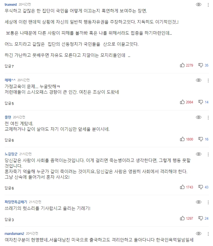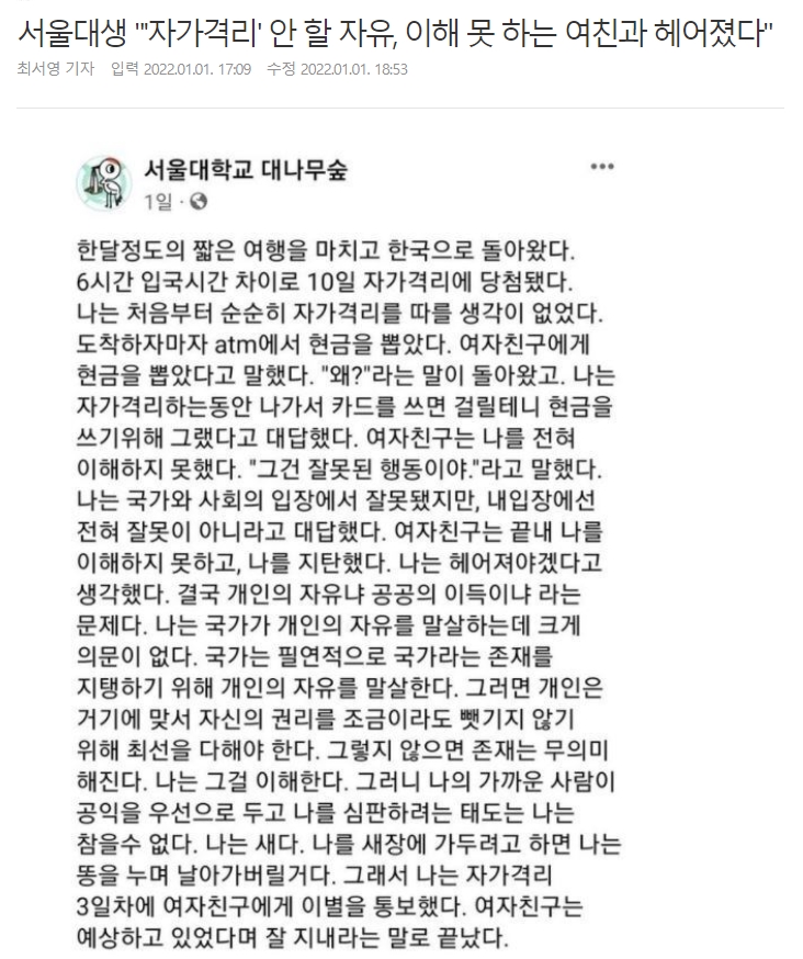 새해 첫 날인 어제 서울대생이 직접 게시판에 쓴 글이 크게 이슈가 되었다. 해외여행을 다녀온 자가격리 대상자가 사회적 거리두기, 자가 격리 등 정부의 방역지침과 관련해 여자친구와 논쟁을 벌이다 결국 헤어졌다는 사연을 공개한 것인데, 처음부터 순순히 자가격리를 따를 생각이 없었다, 도착하자마자 ATM에서 현금을 뽑았다, 여자친구가 이유를 묻자 자가격리 하는 동안 나가서 카드를 쓰면 걸릴 테니 현금을 쓰기 위해 그랬다고 했다고 하더니 이에 여자친구가 작성자의 행동을 지탄하자 여자친구는 끝내 나를 이해하지 못했다며 자가격리 3일차에 이별을 통보했고 잘 지내라는 인사를 끝으로 헤어졌다고 적었다. 일단 여기서 이 서울대생의 인식수준이 의심가기 시작했는데, 이걸로 일방적으로 이별통보한걸 아주 자랑스럽게 여기는 어투였기 때문.