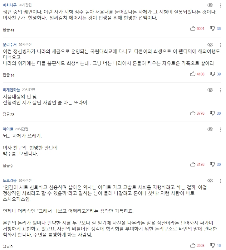 무려 3300여개의 댓글이 달린 이 기사에서 대부분의 사람들은 이 서울대생의 글에 분노를 느낀듯 하다. 여친의 판단이 옳았다는 이야기도 있다.