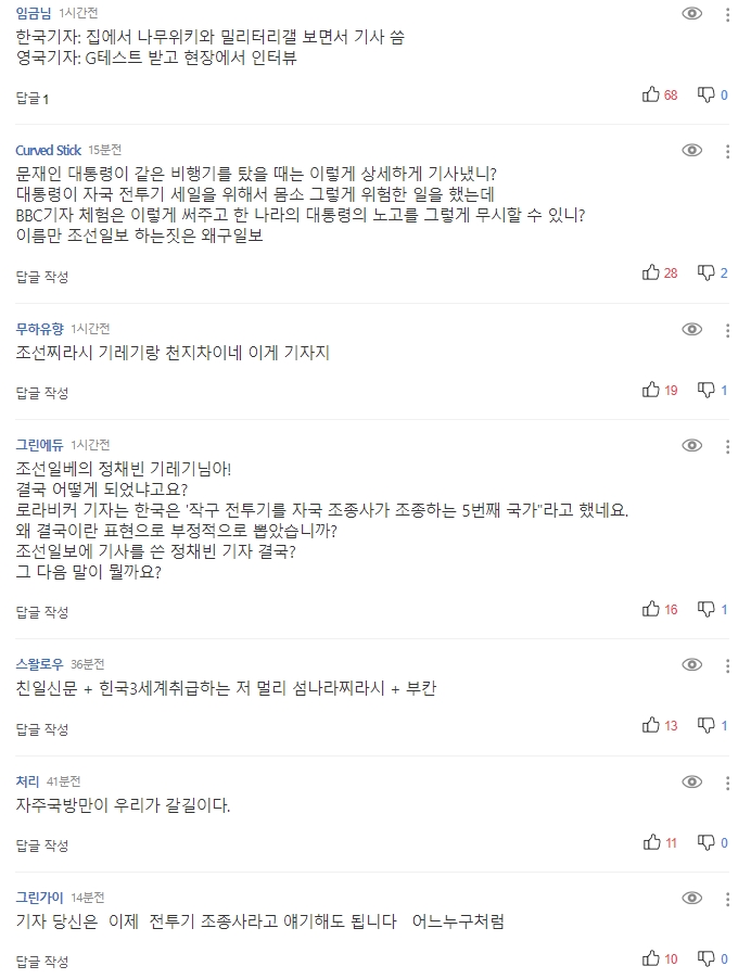 거의 처음으로 기사 전문을 옮겼다. 군더더기 없는 기사는 BBC의 로라 비커 덕분이다. 그녀가 쓴 기사는 외국 특파원이 본 객관적인 사실로 가득 차 있다. 한국은 국산 전투기에 자국 조종사를 태울 수 있는 5개 국가 중 하나이며, 한국이 자체적인 방어를 구축해야 한다는 목소리를 키운 것이 트럼프 전 대통령이었다...조선 기레기가 쓴 기사에서는 절대 볼 수 없는 내용이다. 포탈은 당연히 이런 기사를 메인에 싣지 않고 그래서 댓글도 적지만 내 마음과 똑같아서 남겨 놓는다. 현재 대한민국의 국방력은 2021년 기준 무려 세계 6위다. 박근혜 당시 15위에서 프랑스 등을 밀어내고 단 4년 만에 올라선 거의 기적 같은 순위다. 문재인이 안보보수임이 증명된 것이다.