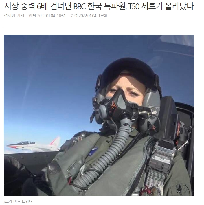 영국 BBC 서울특파원 로라 비커가 국내 개발 고등훈련기 T-50 체험 탑승하기 전 한 말이다. 이후 비커는 “날개를 얻었다”며 비행에 멋지게 성공했다. 4일(현지 시각) BBC는 ‘초음속 전투기에서 북한 보기’라는 제목으로 비커가 T-50에 체험 탑승하는 모습을 담은 영상을 공개했다.