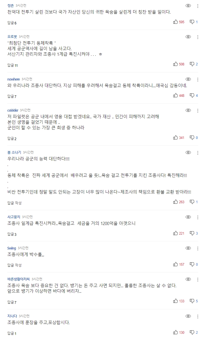 댓글은 당연히 칭찬 일색. 조종사의 실력과 희생정신, 공군의 철저한 대처에 박수를 보낸다.