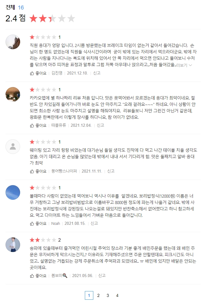 별점은 나쁜 편인데 나는 종업원의 태도 등에는 별로 신경쓰지 않는 사람이라 밥만 잘 갖다 주면 불만이 없는데 서비스에 대한 혹평들이 많은 편이다.