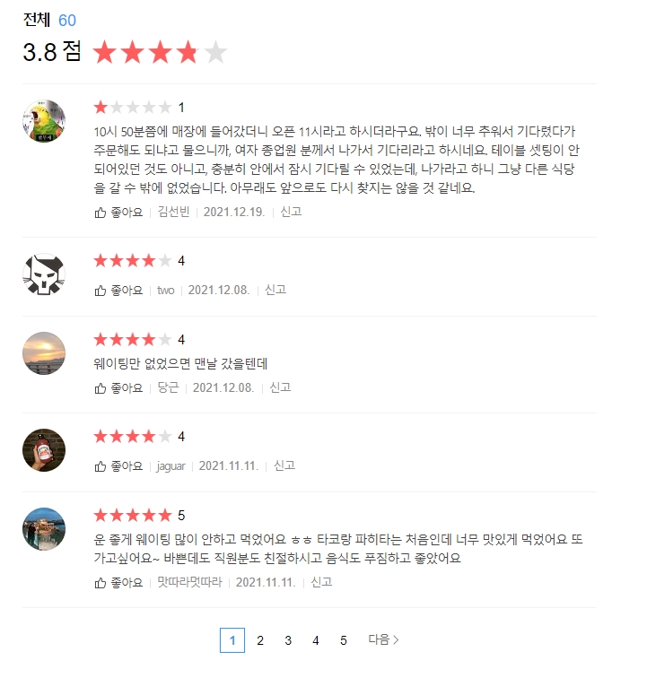 카카오맵 평점은 높은 편. 맨 위는 나와 같은 사정이었는데 나는 그런거에 별로 개의치 않는 사람이라..단 춥고 목소리가 울려서 시끄러웠고 음식이 나오기까지 시간이 꽤 걸렸던 점이 나에겐 단점이었다. 나올때 보니 사람들이 줄 서 있어서 다시 가기엔 좀 망설여진다. 가려면 11시나 점심시간 한참 지나 가야 할듯.