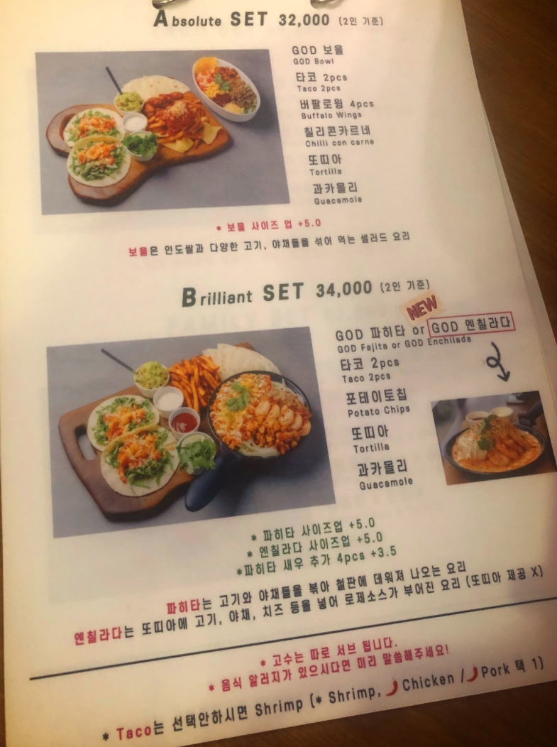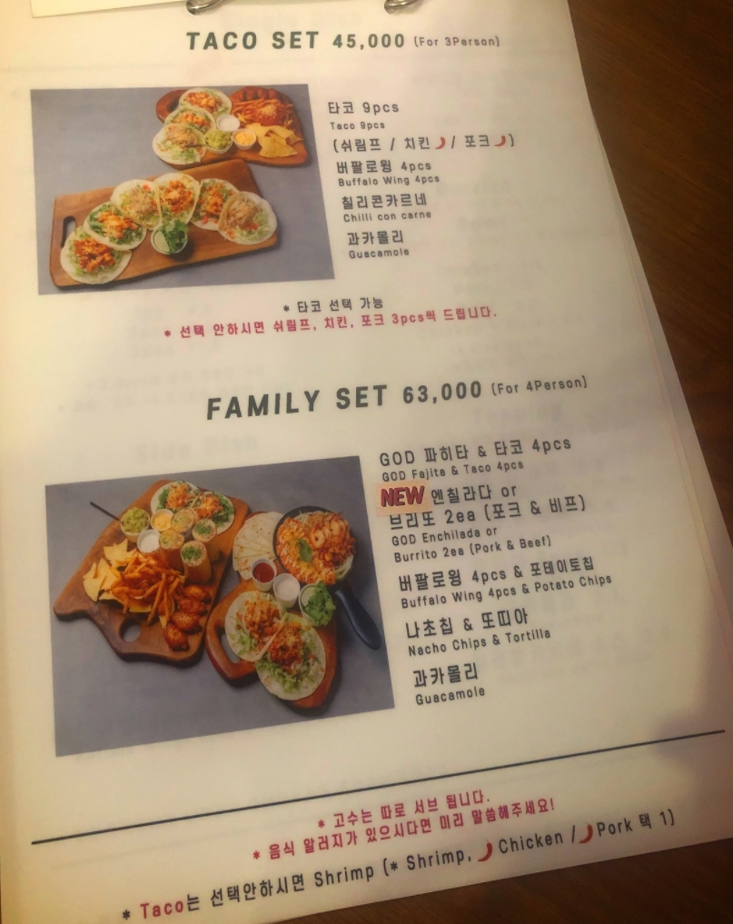 3~4인이면 타코 세트를 시켜도 괜찮을듯.