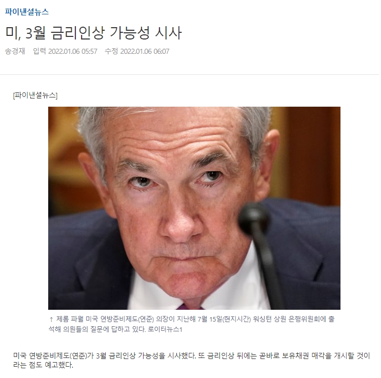 월스트리트저널(WSJ), CNBC 등 외신에 따르면 연준은 이날 공개한 지난달 FOMC 의사록에서 치솟는 인플레이션(물가상승)과 매우 팍팍한 노동시장 흐름으로 볼 때 정책 금리를 이전 예상보다 더 빨리 올릴 필요다 있다는데 합의했다. 의사록은 FOMC '참석자들이 이전에 예상했던 것보다 더 조기에, 또는 더 빠른 속도로' 금리를 올릴 필요가 있다는 판단을 했다고 전했다.