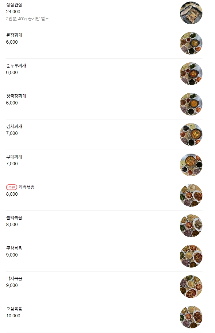 메뉴는 대략 아래와 같다. 나는 기사식당에 가면 보통 불백을 시키는데 찌개류 먹는 손님들이 많았다.
