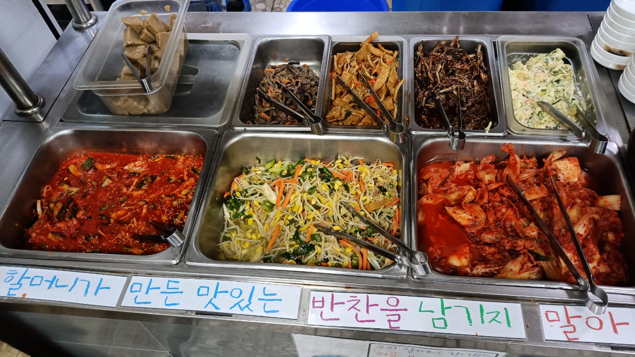 이곳은 반찬이 처음부터 셀프고 물은 갖다 준다. 반찬은 아래와 같이 꽤 많은 편이고 넓은 그릇에 한 번에 가져갈 수 있다.