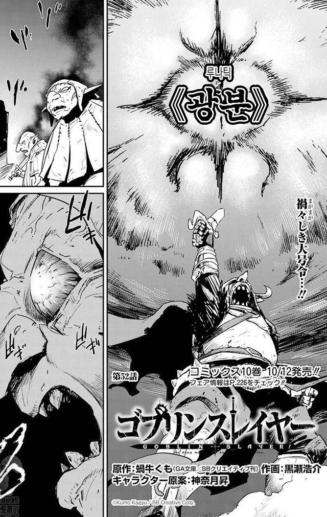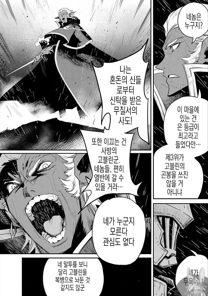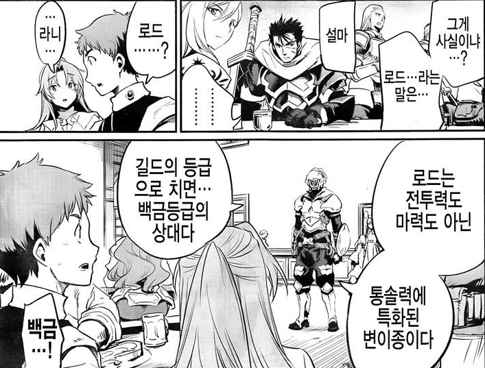 챔피언까지는 쉽게(?) 진화가 가능한 것 같지만 이를 넘어선 개체들도 있다. 우선 12화에 나왔던 이 고블린 로드는 고블린 슬레이어의 설명에 의하면 길드 등급으로는 무려 백금 등급에 해당하며 통솔에 특화된 진화형태다.